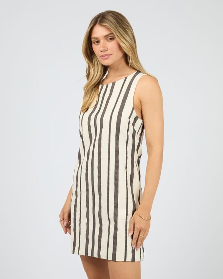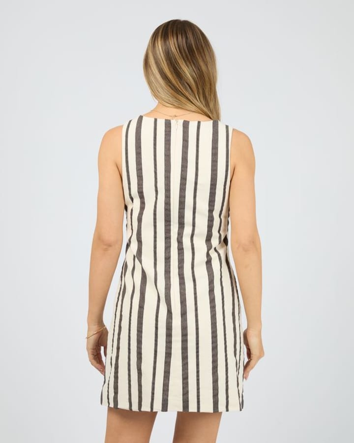The Rosa Stripe Mini Dress is your go-to for effortless spring styling, featuring a high rounded neckline and classic brown stripes on a soft vanilla base. Made from a breathable cotton blend, it offers a relaxed yet polished silhouette. Style it with sandals for an easy, sun-ready look made for long days outdoors.