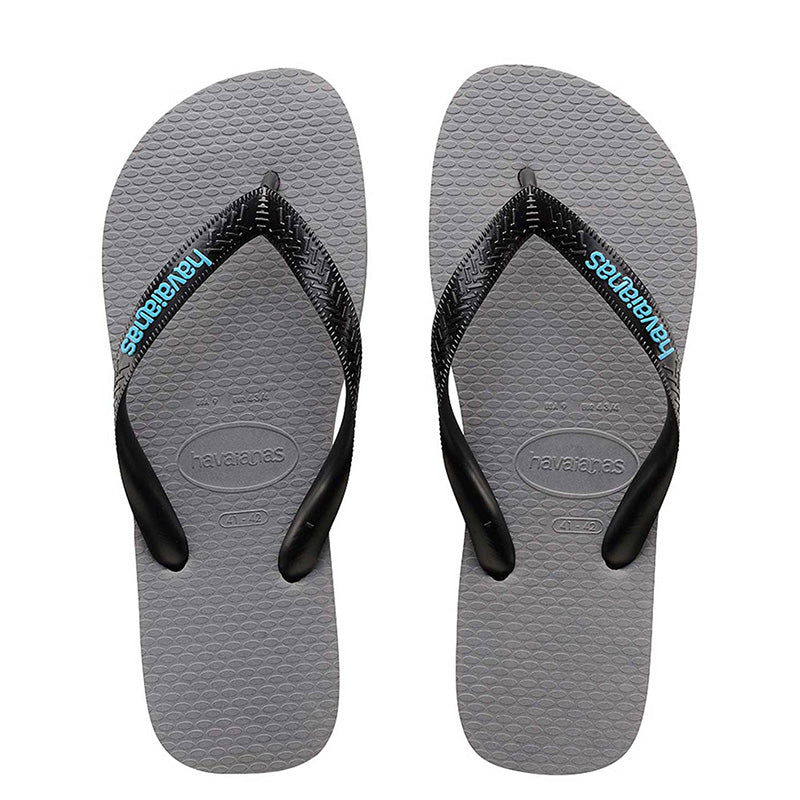 Havaianas Kids Rubber Logo Steel Grey Thongs. Classic grey kids Top Havaianas with matching black top straps and a blue rubber logo to complete the look.