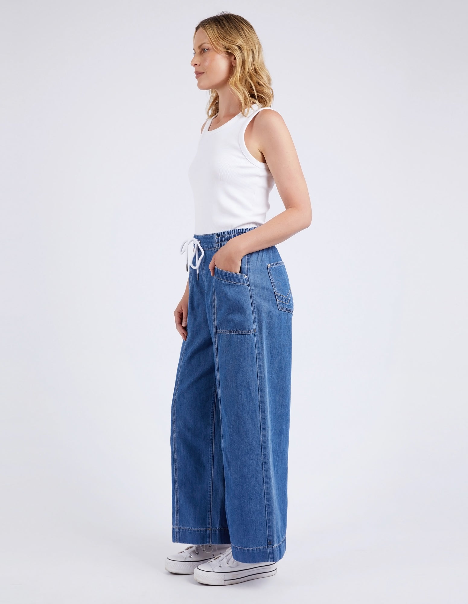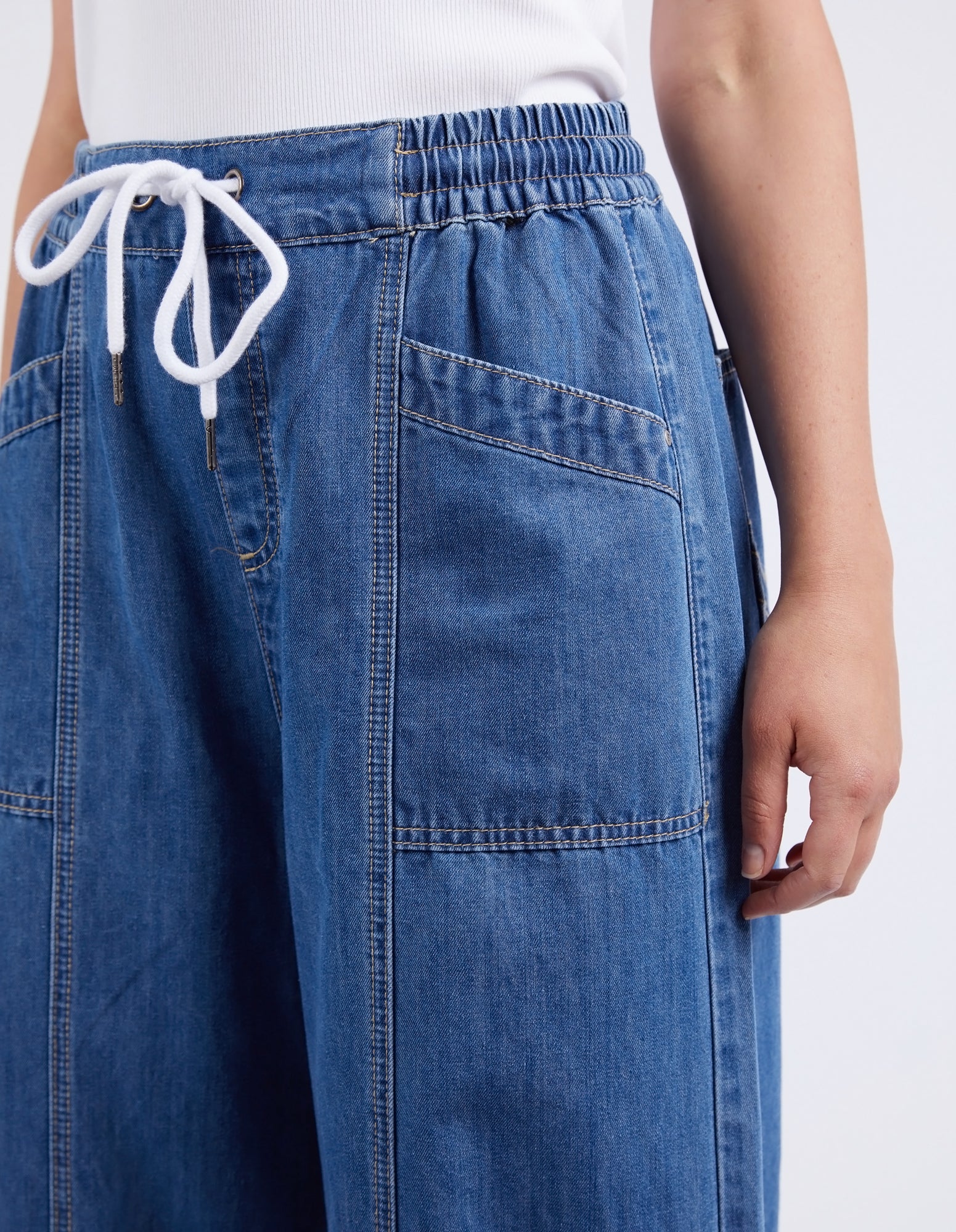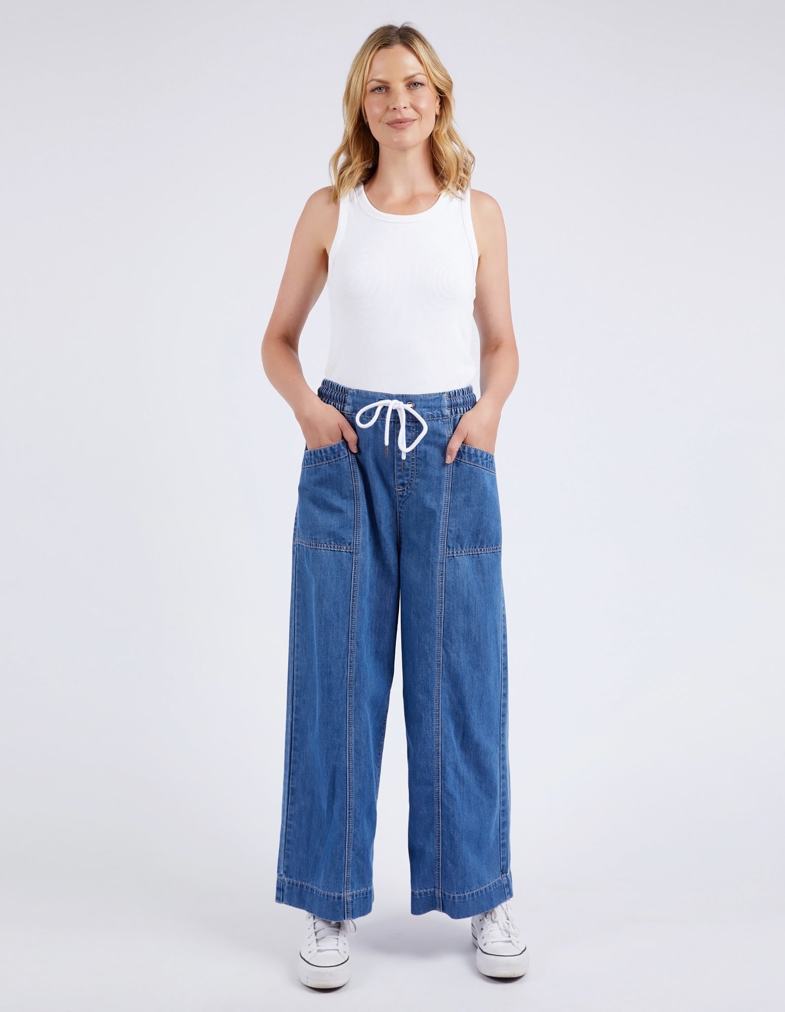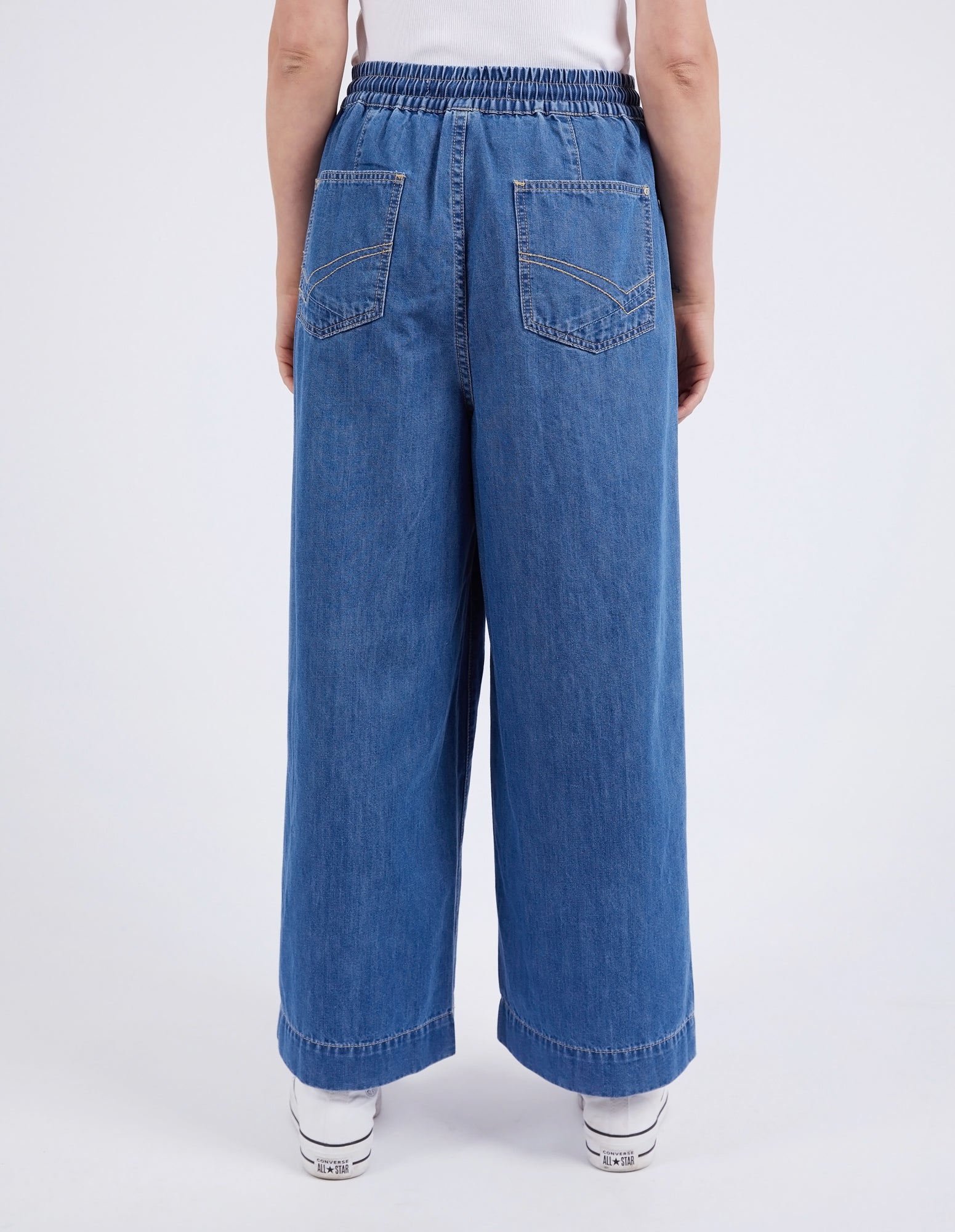 If you love the look of jeans but want something lightweight and easy to wear, look no further than the Alora Wide Leg Jean. A new fit from Elm Lifestyle, these pants feature an elastic waist, pockets, wide leg and top stitching for that extra bit of special.