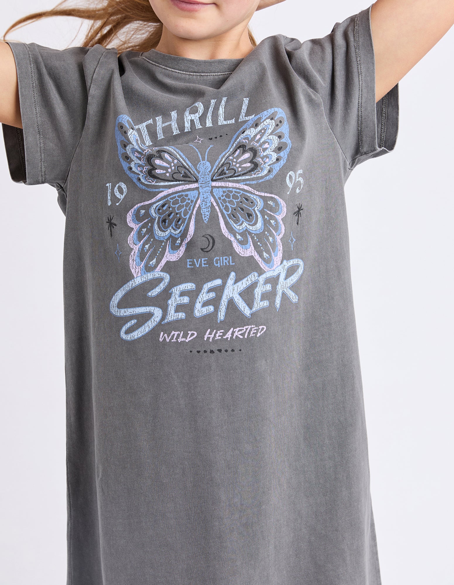 The Wild Heart Tee Dress by Eve Girl is a must have this season. Our classic tee dress shape features a new fun and fresh chest print, on a washed charcoal cotton jersey fabrication. Complete with a rib neckline and relaxed fit, this dress is the perfect everyday piece.
