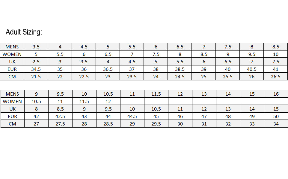 * All sizes are in Men’s sizing. To work out ladies sizing, add 1.5. Eg: Mens size 8 = Ladies size 9.5.