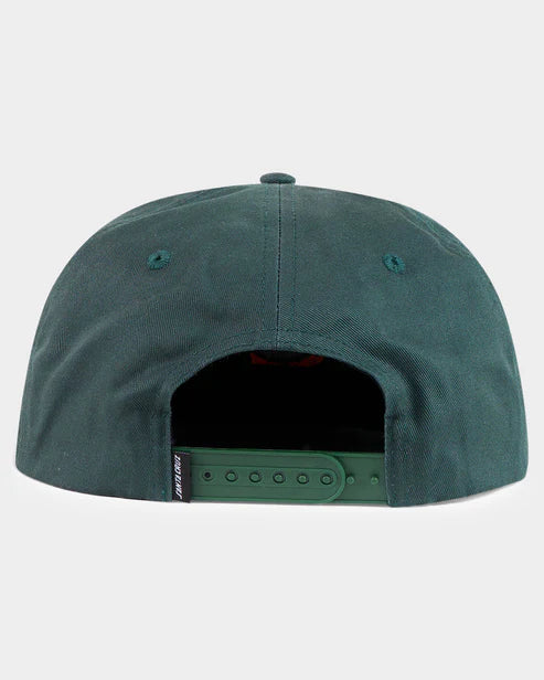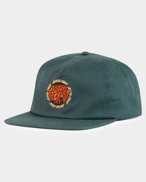 Men's Santa Cruz 5 panel flat peak unstructured snap back cap featuring embroidery of the Skate Brain Dot artwork.