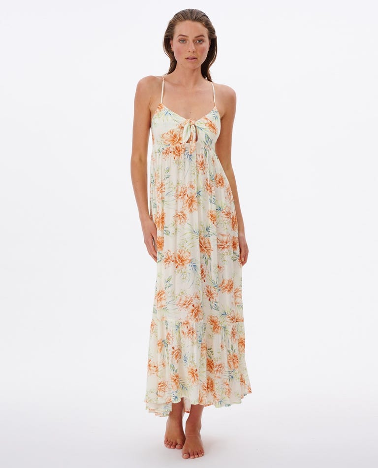 The Sol Seeker Maxi is a great women's dress made with sustainability in mind from light and flowy EcoVero fabric. Designed with a tall silhouette, with adjustable straps and functional front tie for ultimate comfort and a smart casual aesthetic. Featuring smocking details and Sol Seeker collection yardage print.