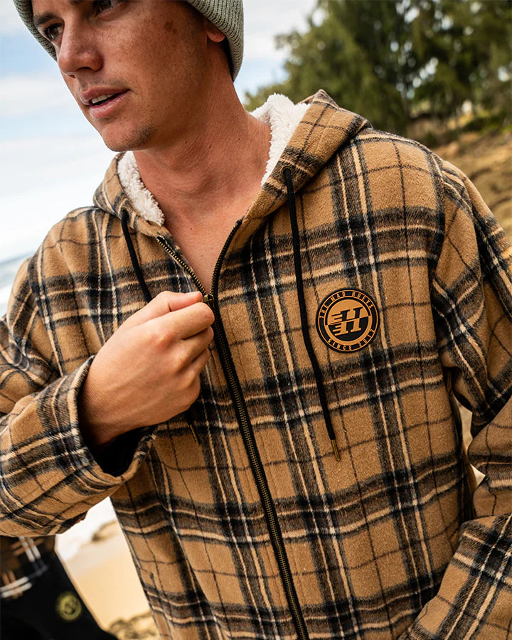 Stay warm and sharp with the HAZZA | JACKET in Walnut, a Hueys best seller year after year. Featuring a rugged check pattern and a sherpa-lined hood, this jacket is built for all-day comfort and style. The embroidered badge adds that iconic Hueys touch, making it perfect for those who live for the surf, fish, and party life—even when it’s chilly out.