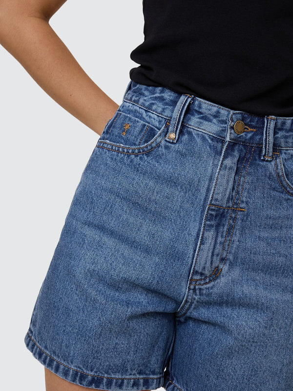 Cool, clean, and made to move, the Koko Short in Stoned Blues is a no-brainer for spring and long summer days. Crafted from a premium, midweight denim with a 60/40 cotton blend, these high-waisted shorts serve structure without sacrificing comfort. The wide hems and faded wash lean into true vintage denim shorts territory, while the 5-pocket design offers styling versatility. Whether paired with women's crop tops or women's oversized graphic tees, these casual cotton shorts are a street-ready hit.