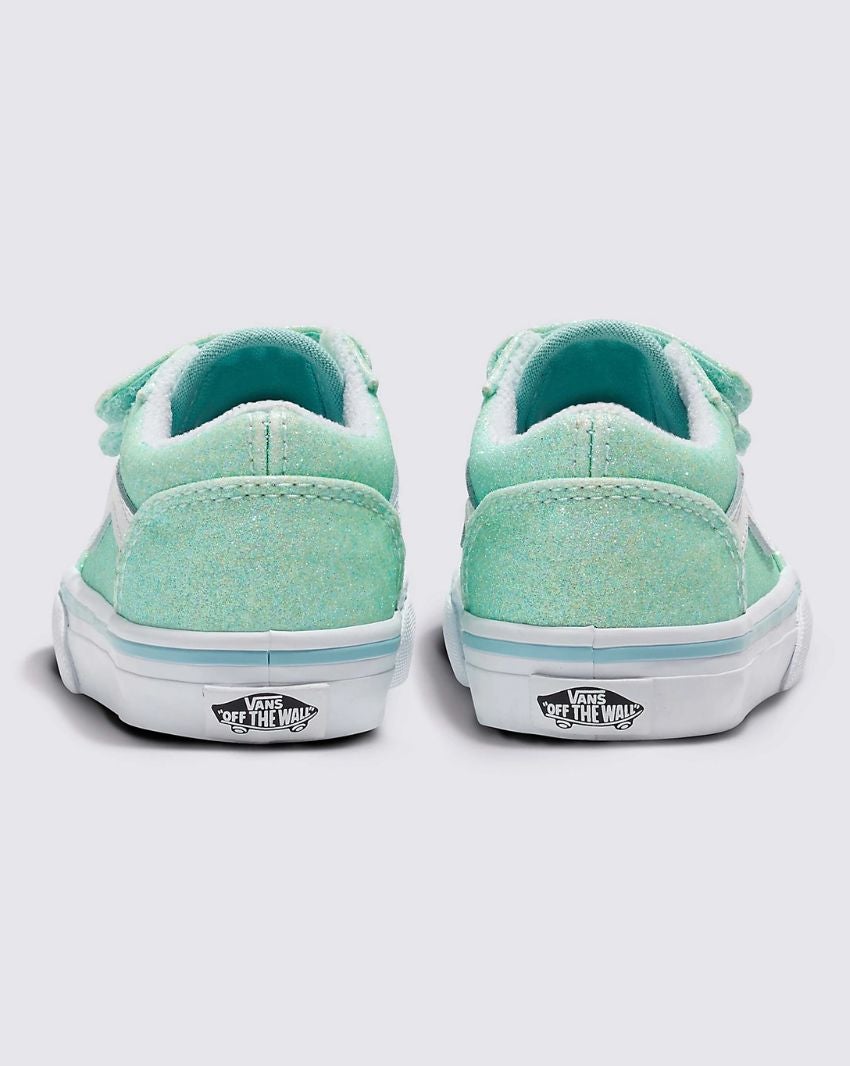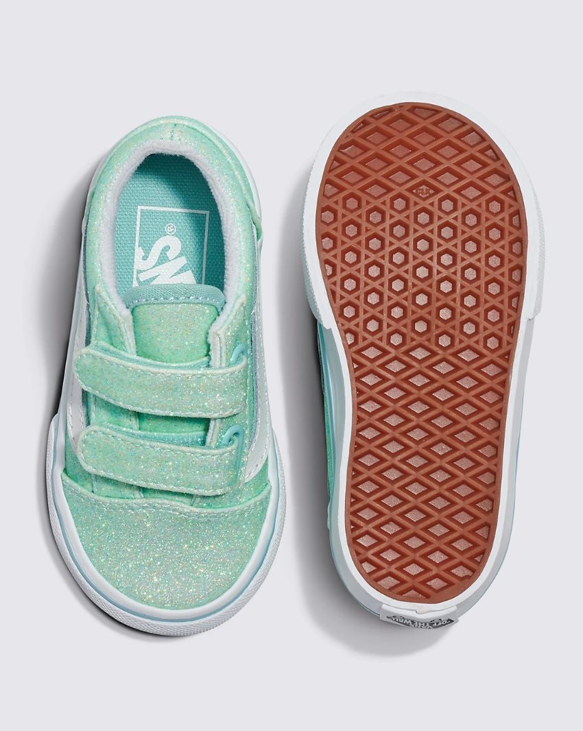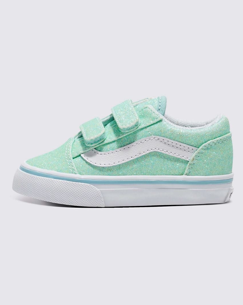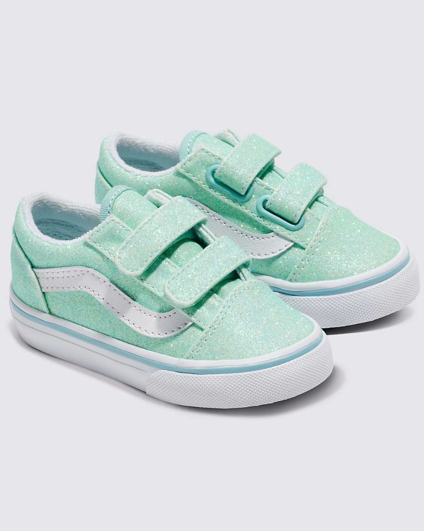 Strap Closures Create a Toddler-Friendly Fit on this Iconic Sidestripe Shoe. The Kids Old Skool V reimagines our iconic Sidestripe shoe by swapping traditional laces for double hook-and-loop closures. With all-over glitter that adds sparkle to every step, this low-top style maintains its classic appeal while providing an easy, secure fit that keeps your little one comfortable all day.