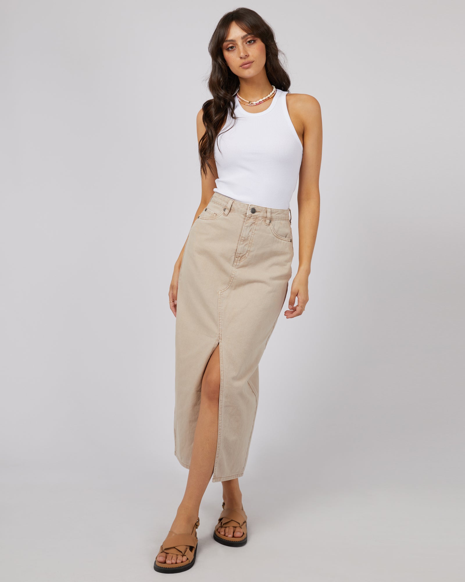 Introducing the Pia Maxi Skirt in beige denim. This elegant maxi skirt features a sleek front slit opening and practical front and back pockets for a blend of style and functionality. With belt loops for added versatility, it can be dressed up with a chic blouse or worn casually with a simple tee. Perfect for any occasion, the Pia Maxi Skirt offers a timeless look with modern details.