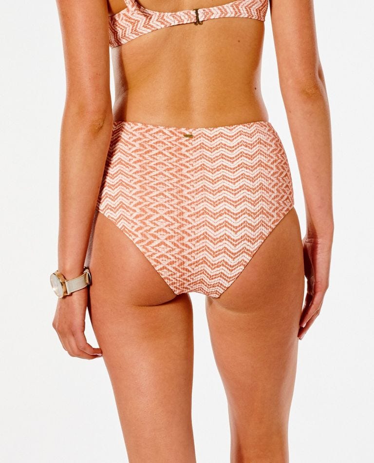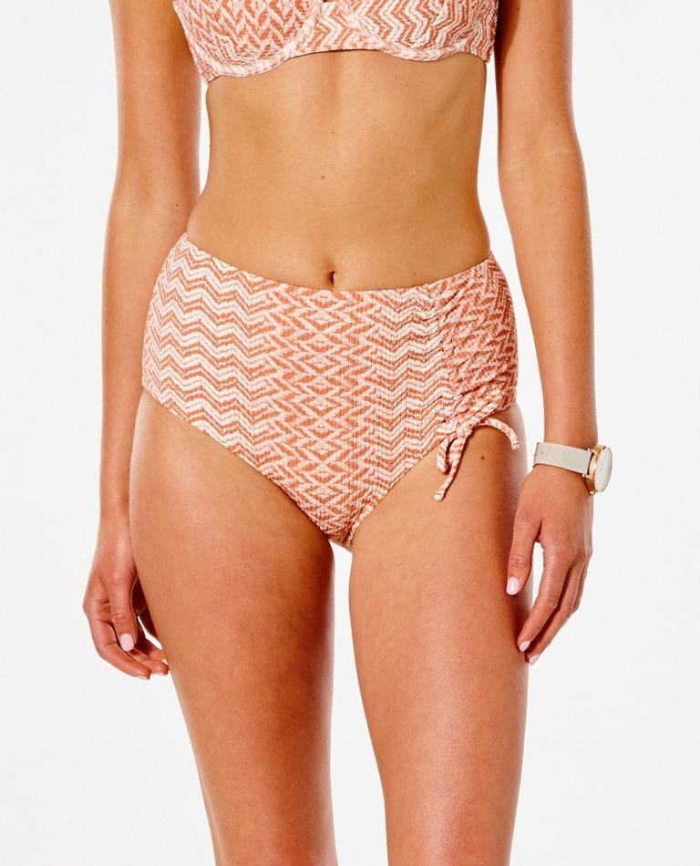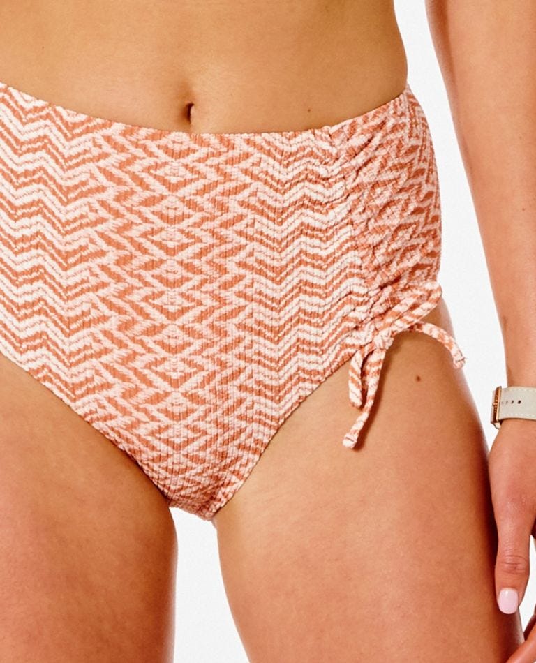 Ripcurl Drifter Hi Waisted Good Coverage Bikini Bottoms boast a ultra feminine look which will make you feel great this summer. Featuring a gathered tie in the front and Jacquard fabric.