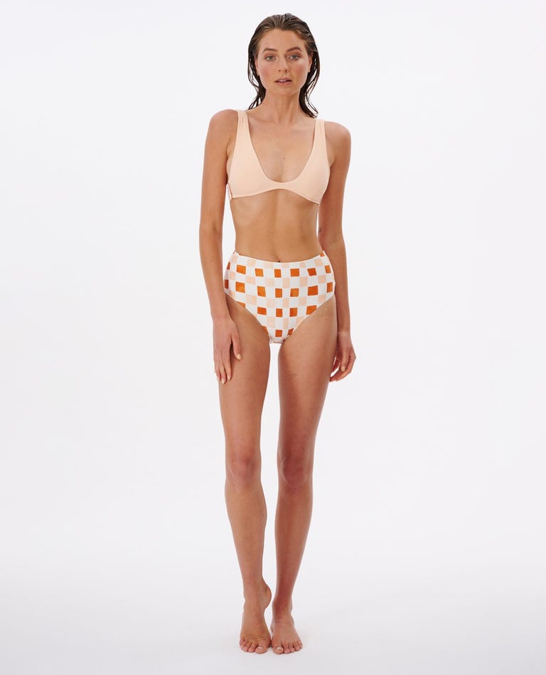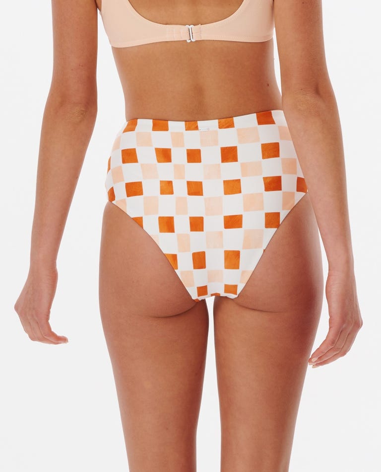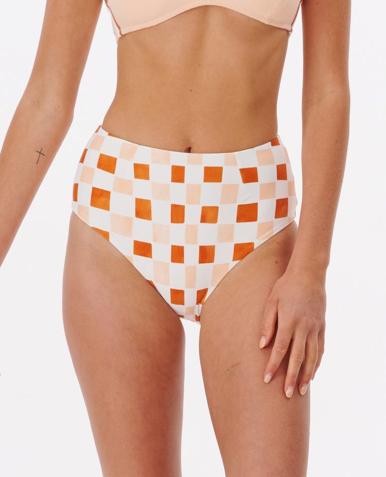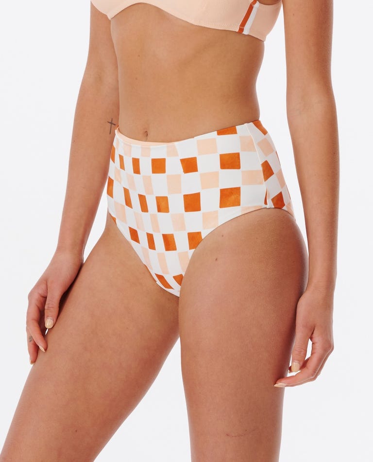 The Surf Check High Waisted Cheeky Coverage Bikini Pant is a great women's bikini bottom designed with a slightly slimmer silhouette at back. Featuring a fully lined seat, modern high rise fit, and all over chequered print.