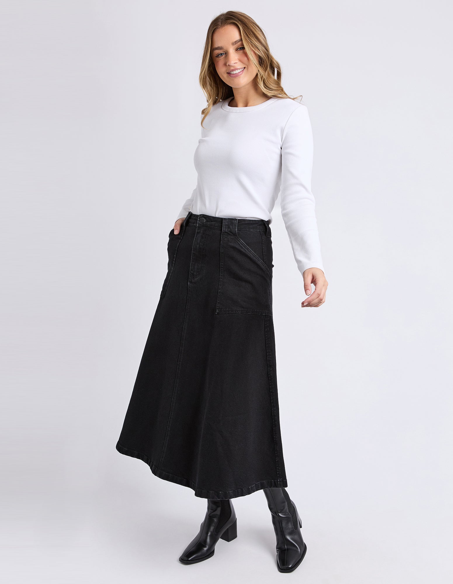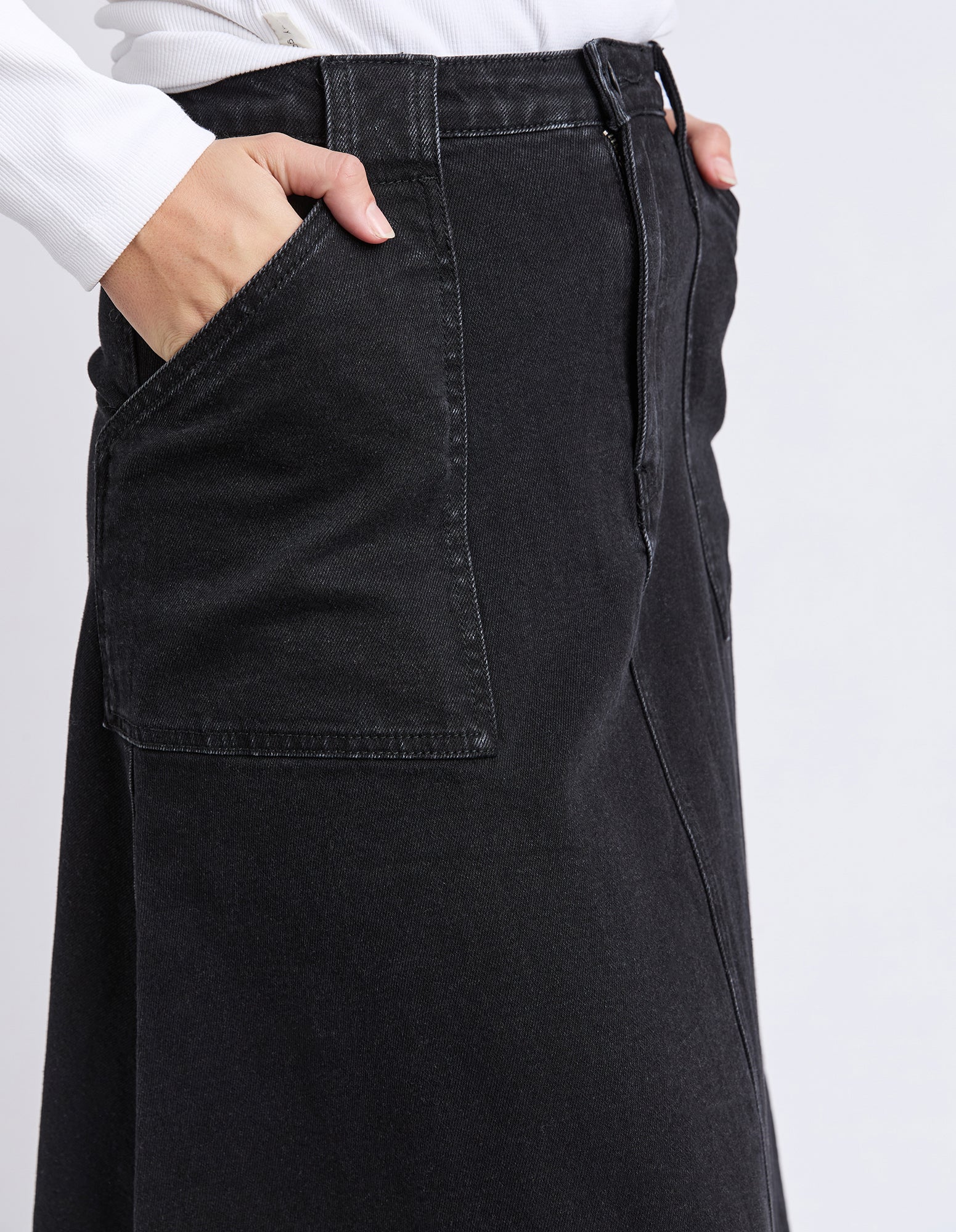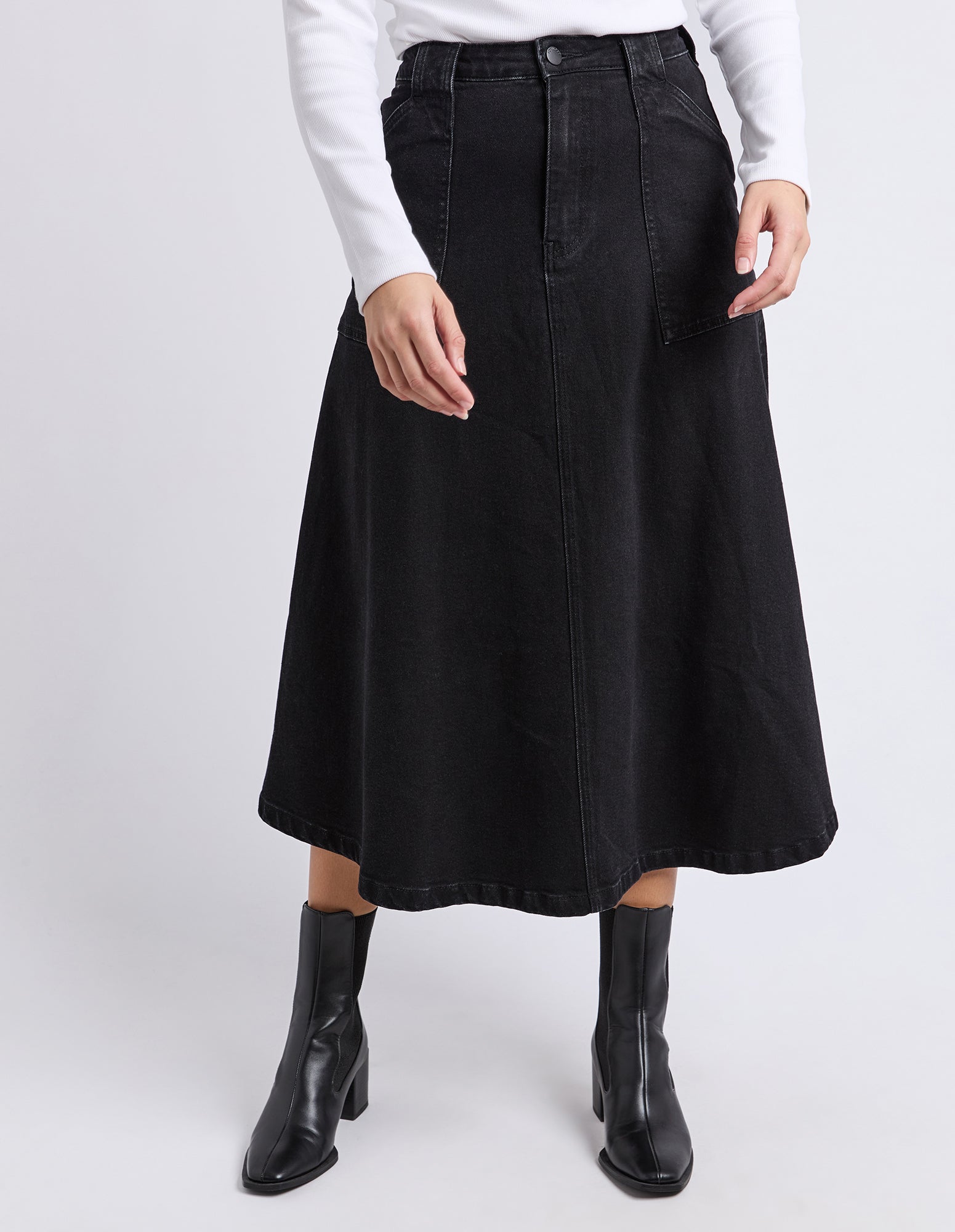 The Potter Skirt brings a modern spin to classic denim with its full, easy-moving shape and clean front fly. Designed with front patch pockets and just the right amount of stretch, it’s made for all-day comfort without losing structure. Style it with boots or sneakers and let it do the talking.