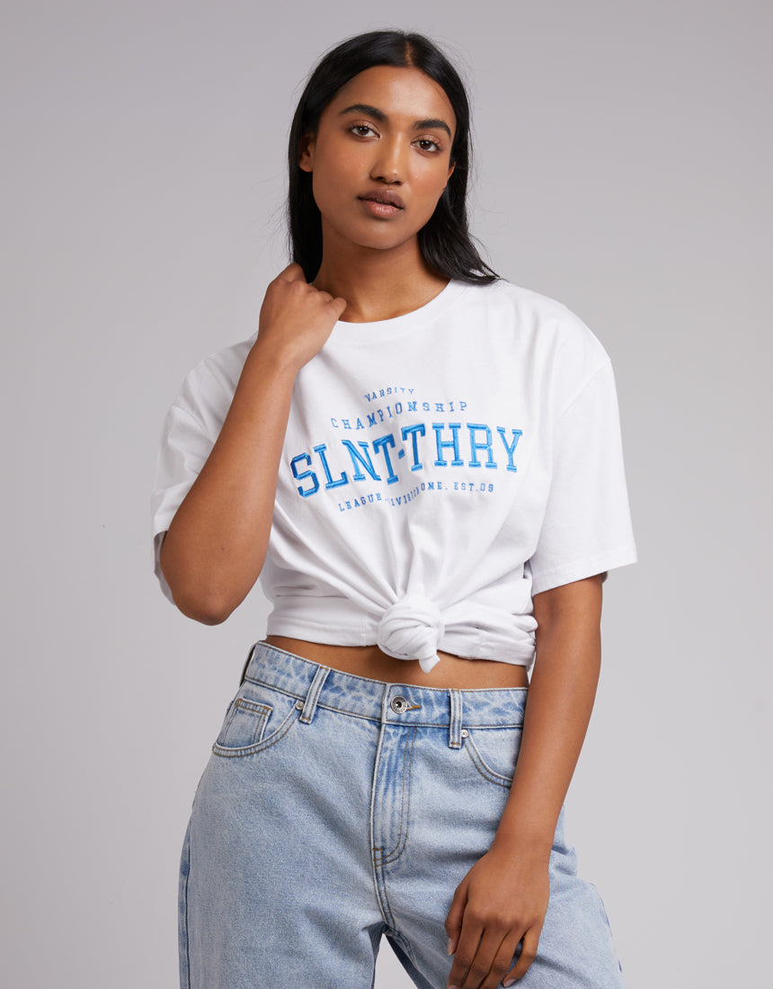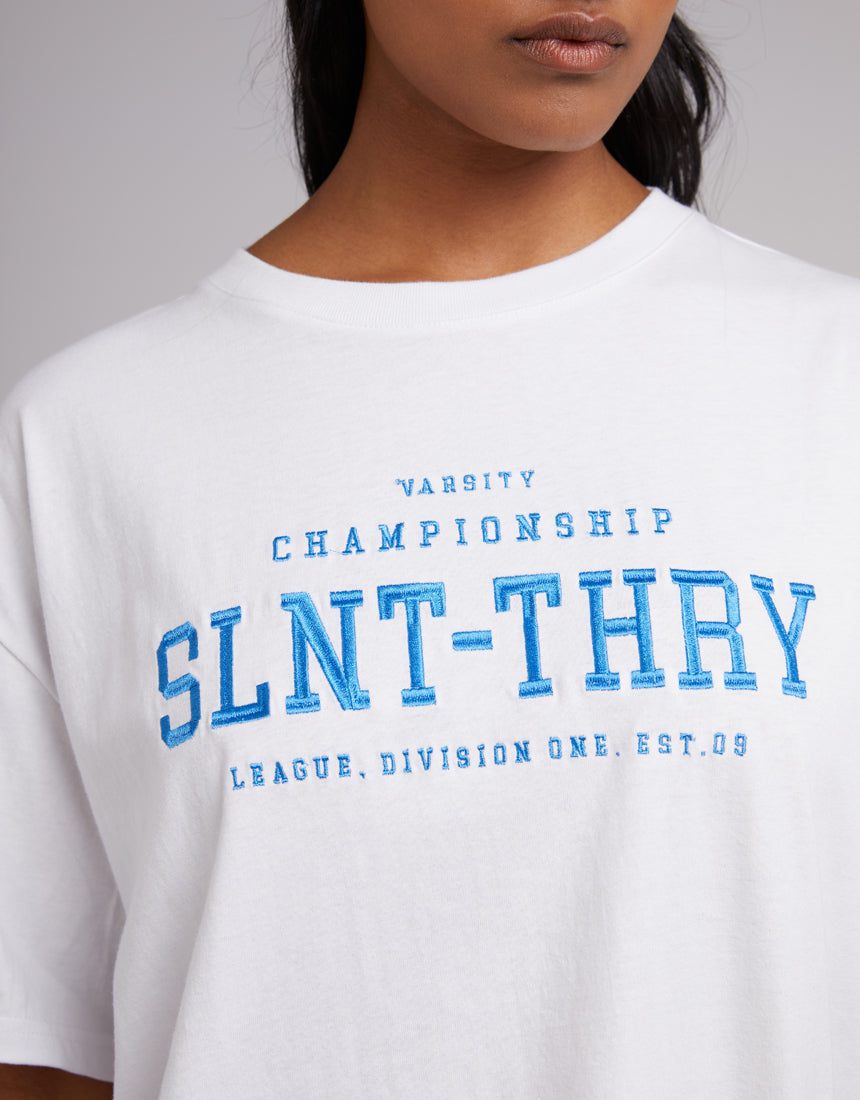 Love a basic oversized tee? Look no further than our Varsity Tee from our latest On Campus Collection. This tee is crafted from a heavy weight cotton jersey and features and oversized fit and embroidered branded artwork. Pair back with your favourite Silent Theory denim for a casual yet cool look.