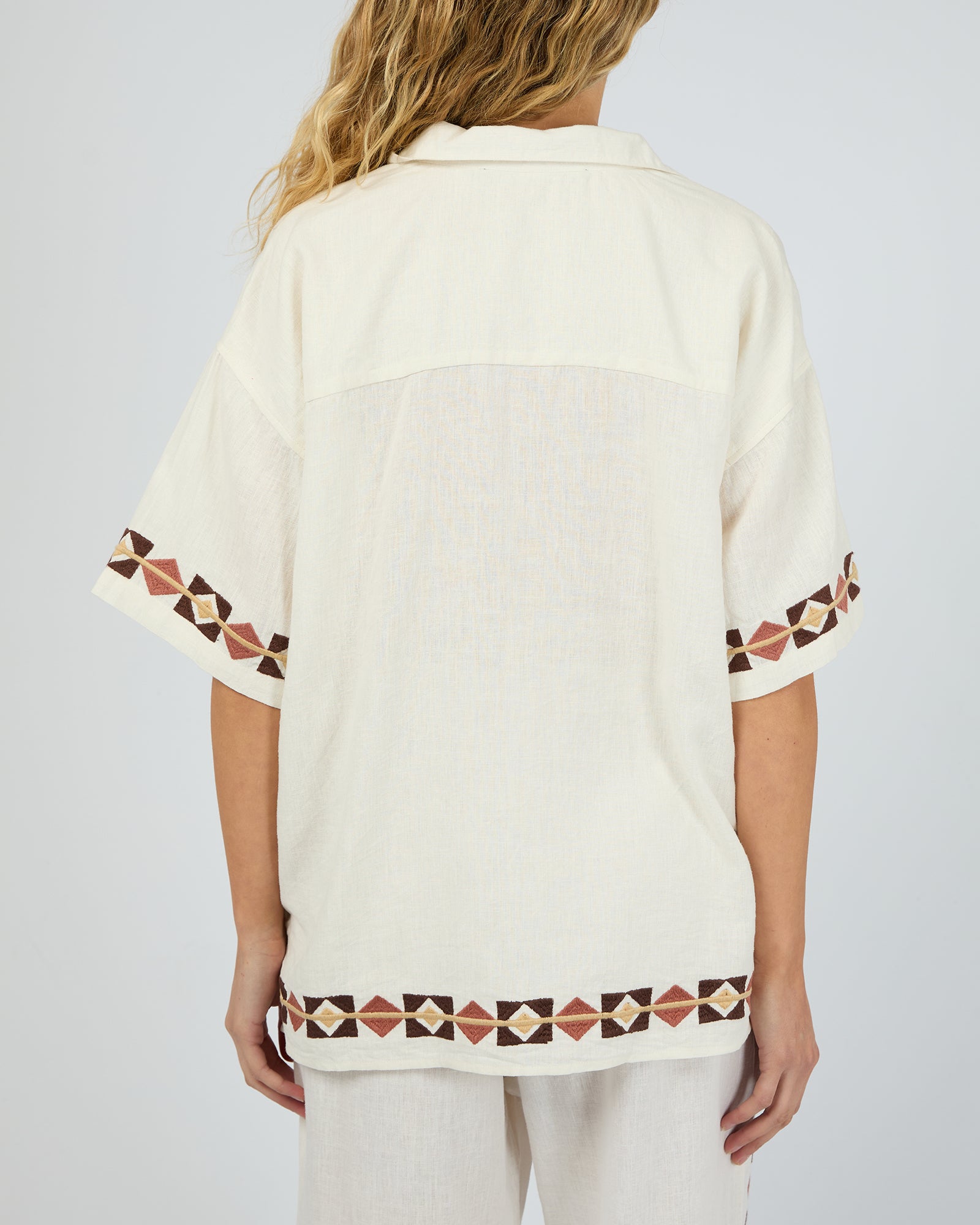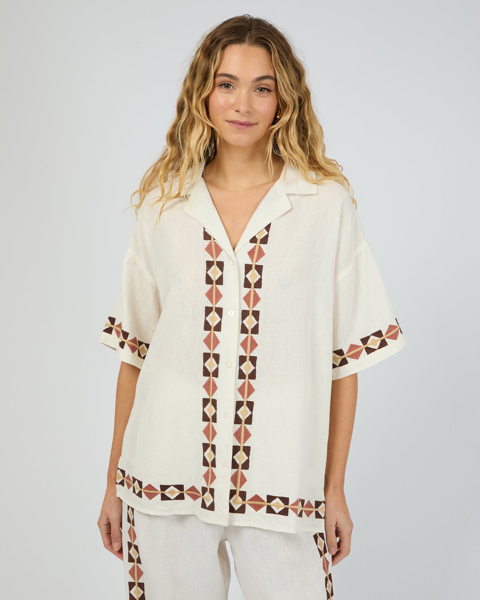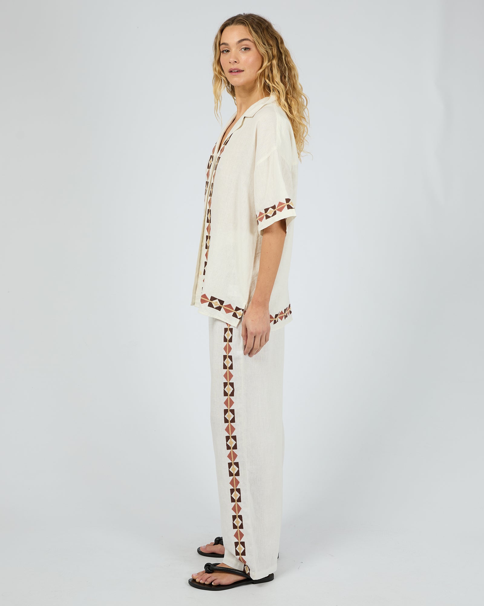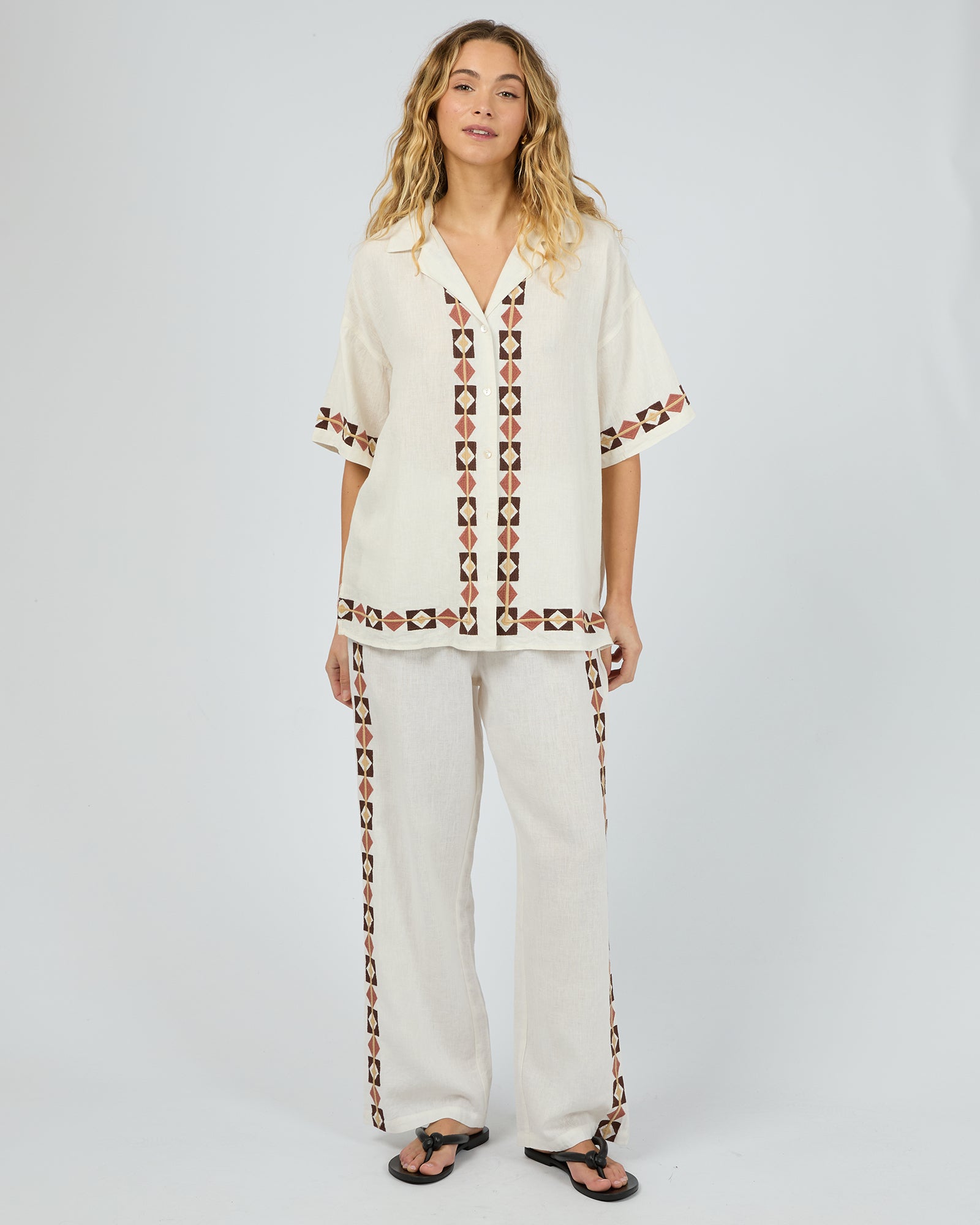Effortlessly stylish, the Los Cabos Shirt features a relaxed fit and embroidered border detail. Perfect for any occasion, the vintage white colour and linen viscose blend provide both comfort and style for every woman. Add it to your wardrobe today!