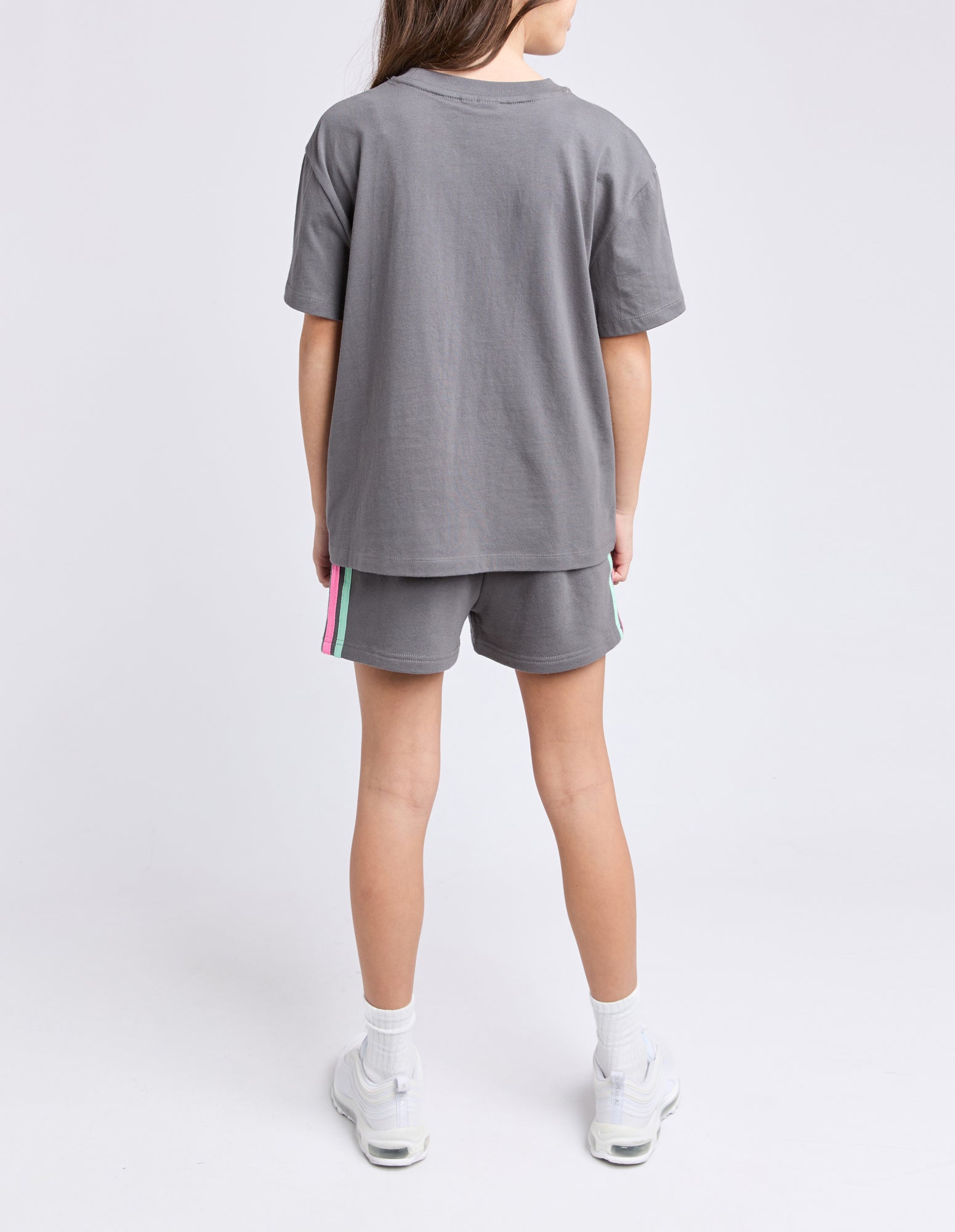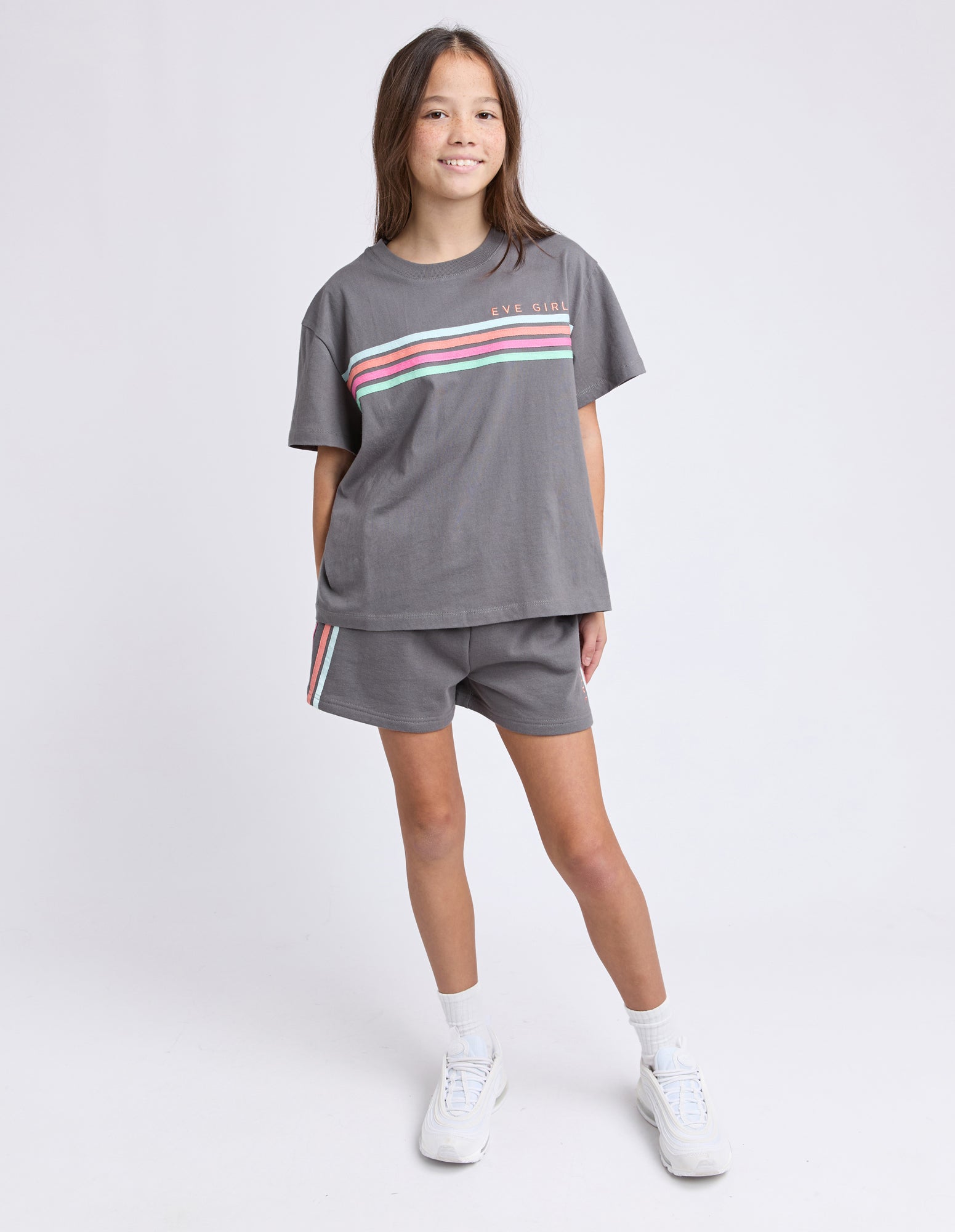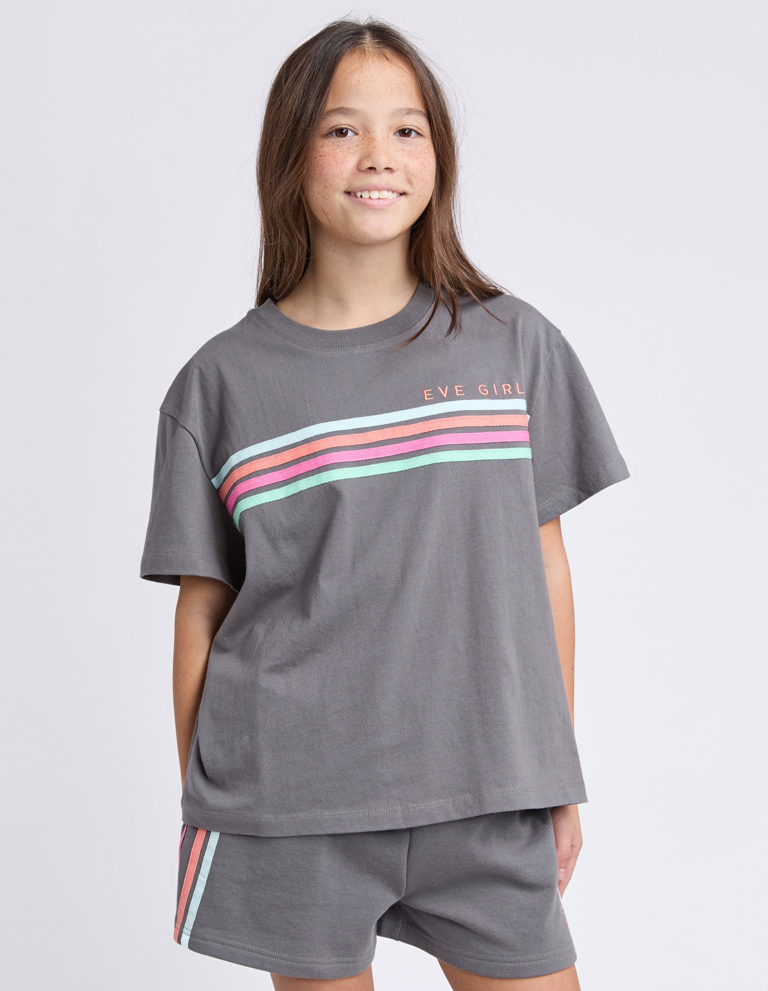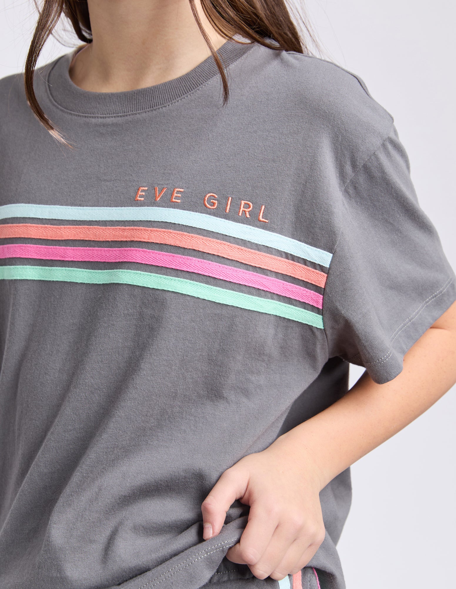 The Retro Tee features contrast taping and Eve Girl embroidery on the chest for a fun pop of colour on a charcoal base. The oversized fit and ribbed neck band with a round neckline ensure easy wear and a trendy look she’ll love. Perfect for everyday wear!