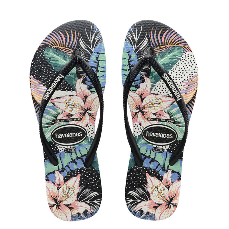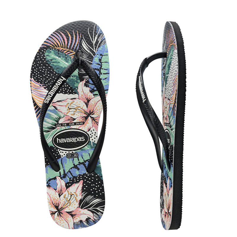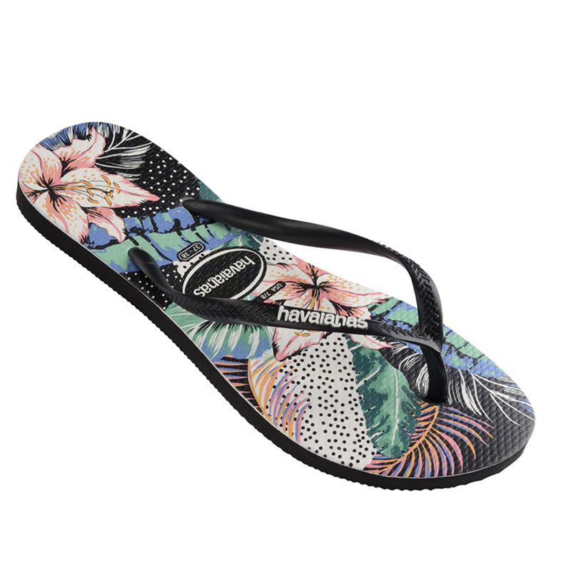 Havaianas Kids Slim Floral Dots Black Thongs. What's better than a floral print? Your little one can be cat walk ready in this summery and bright floral print for kids. This style features classic black slim Havaianas with a floral print and flowering hibiscus printed across the soles and matching slim black Havaianas straps with a contrast white rubber logo to complete the pair.