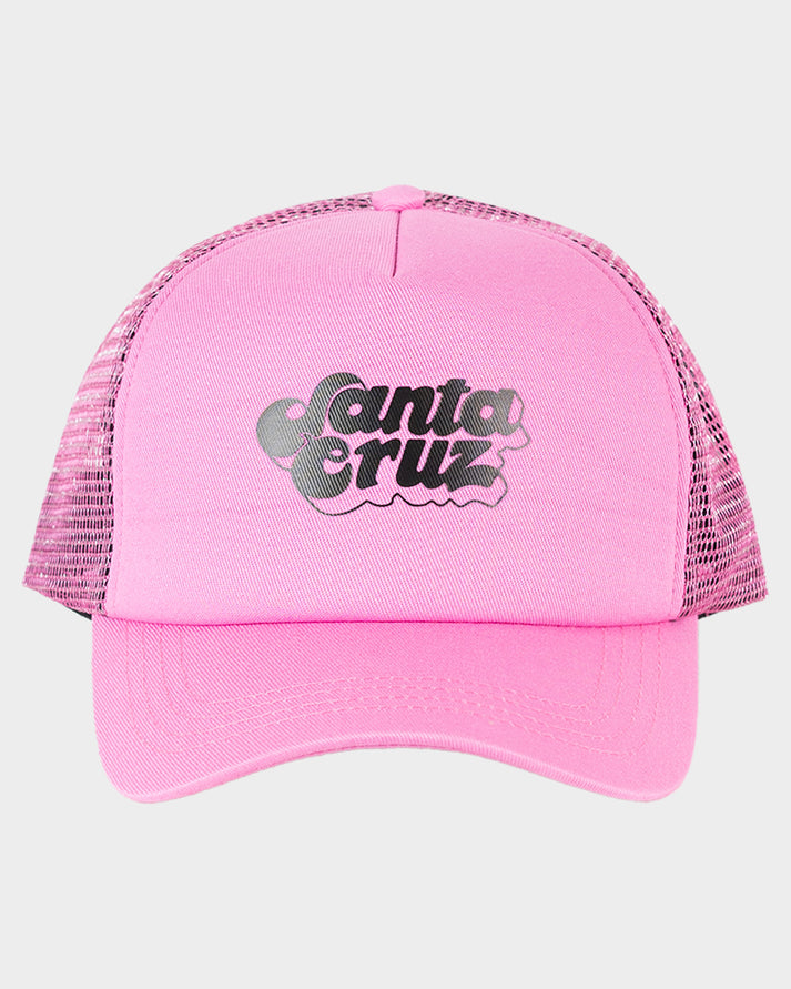Girls Santa Cruz curved peak snapback trucker hat featuring screen print of the Groovy Stack artwork.